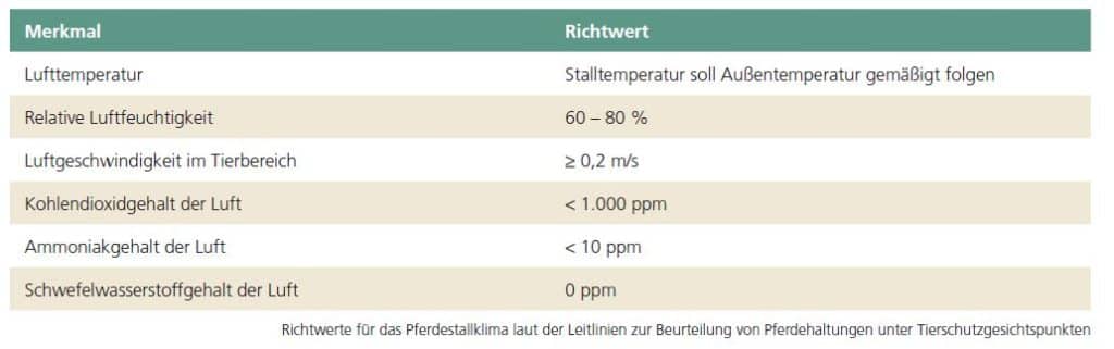 Neben der Stallhygiene trĂ€gt eine gute BelĂŒftung erheblich dazu bei, Schadgase, Staub und Keime zu reduzieren. FĂŒr einen ausreichenden Luftaustausch ist laut Leitlinien eine Luftgeschwindigkeit von mindestens 0,2 m/s notwendig. Zug gilt es zu vermeiden, eine gesunde Luftbewegung tritt – im Gegensatz zum Luftzug – immer großflĂ€chig auf den Pferdekörper. Ausschlaggebend ist dabei die Bauweise des Stalls.