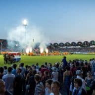 „Welkom Nederland“ lautete das Motto an diesem Abend. Und das war nicht nur auf den Tribünen spürbar, sondern auch auf dem „Heiligen Rasen“. Schon vor der Eröffnung stimmte ein nostalgisches Grenzszenario am Dreiländereck auf dem Rasen auf die Show ein. Bilder aus längst vergangenen Zeiten wurden wieder lebendig: Schmuggler, Zöllner, Barrieren, Schlagbäume und viel mehr.