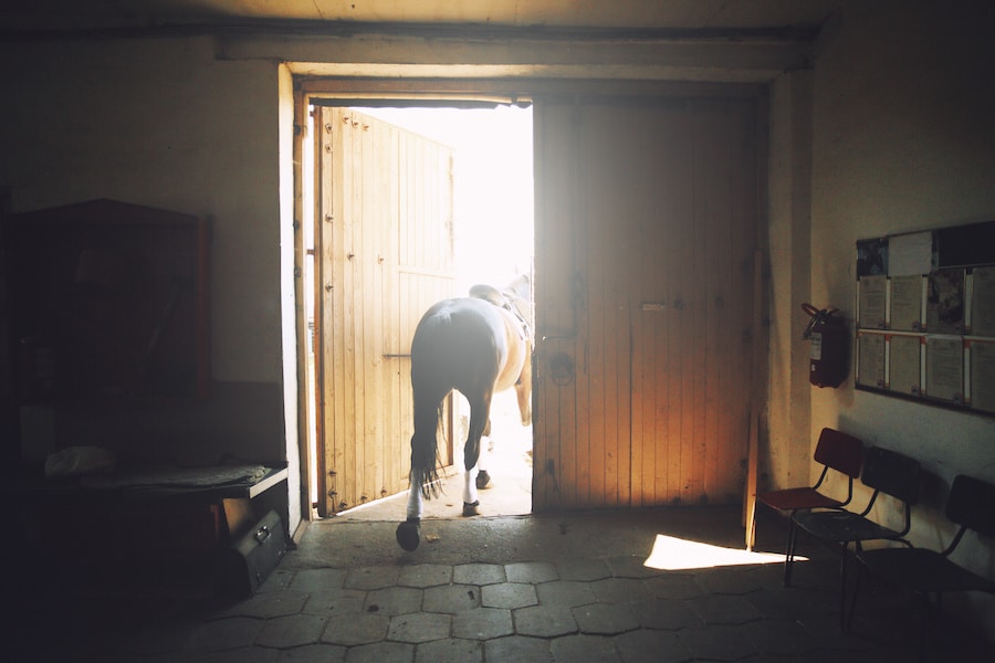 Closeup of a black sporting horse in the stable.