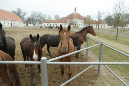 Während Stuten mit ihren Fohlen das frische Grün genießen, lassen übermütige Jungpferde auf einem Paddock vor dem Landstallmeisterhaus beim Toben und Kräftemessen Sandwolken entstehen. Eifrige Gymnasiasten genießen neben den Auszubildenden des Gestüts beim Putzen und Reiten die Abwechslung vom Theorie geprägten Schulalltag. Ob sich die Schüler der geschichtlichen Bedeutung ihrer Umgebung bewusst sind? Es ist die räumliche und geschichtliche Nähe zum preußischen Königshaus, der die Neustädter Gestüte den Beinamen „Sanssouci“ verdanken. Wer an den weiß verputzten, klassizistisch streng gegliederten historischen Gebäuden vorbeigeht, die schattenspendenden Alleen und wie mit dem Lineal gezogenen Wege bewundert, ahnt meist nicht, dass das Haupt-­ und Landgestüt nordwestlich von Berlin unter strikten wirtschaftlichen Gesichtspunkten am Reißbrett entstand.